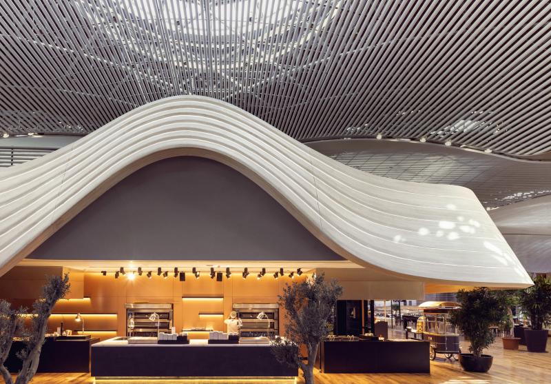 Лондонская архитектурная фирма Softroom спроектировала шесть залов ожидания в стамбульском аэропорту, соединенных почти километровой параметрической стеной, которая считается самой длинным объектом такого рода в мире.
