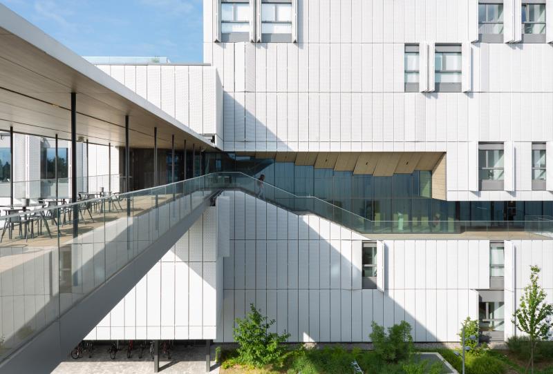 Недавно построенное студенческое общежитие предлагает своим космополитичным обитателям широкий спектр удобств – эксклюзивно оборудованные зоны отдыха, библиотеку, фитнес-студию и многое другое. Различные части этого студенческого общежития соединены между собой коридорами с открытыми переходами. Материалы для потолков и стен выполнила компания durlum.
