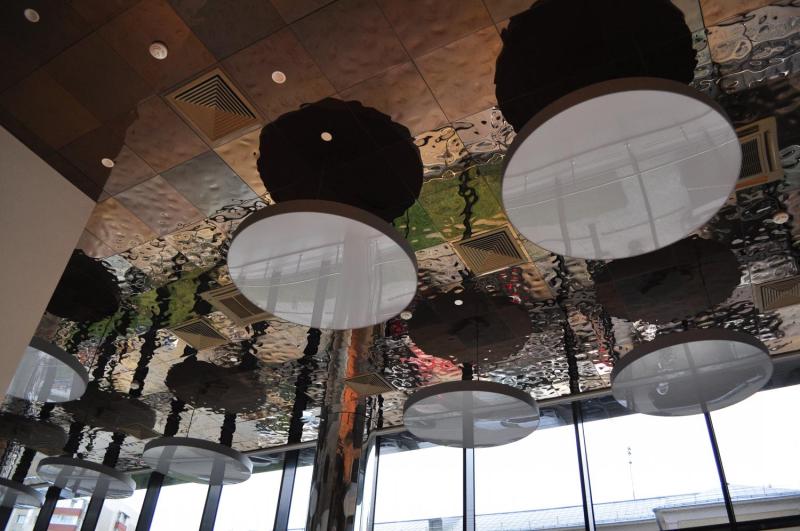 Имитация водной поверхности создает живое и динамичное пространство. Изгибы металла повторяют мелкую рябь, при этом рельеф панелей не повторяется: количество и расположение волн различно у каждой панели. Неровности материала рождает множество разнообразных отражений, преломляет свет, изменяет пространство в зависимости от погоды и освещения.