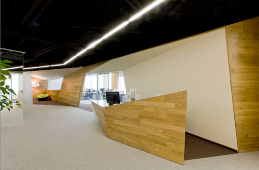 Офис занимает весь пятнадцатый этаж нового бизнес-центра «Палладиум». Здание в сечении близко к кругу, так что пространство офиса сосредоточено вокруг лифтовой группы и технических помещений. В плане оно напоминает подкову. В результате проектирования и строительства образовались почти прямые коридоры. Такого эффекта удалось достичь благодаря размещению экспрессивных объемов, формирующим облик офиса, и организации камерных "ячеек"-переговорных, выделенных в проходной зоне.