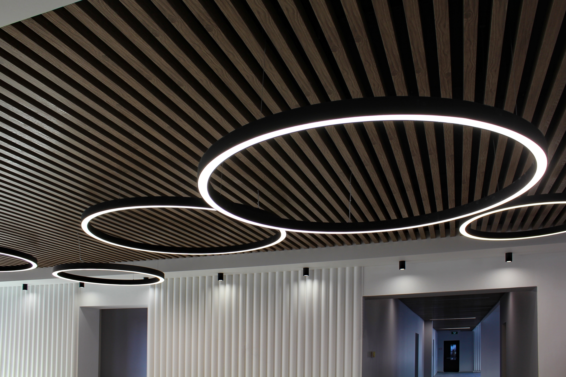 Применение: торговые центры, фитнес-центры, жилые комплексы, университеты, офисы. - Кубообразные потолки (Кубота) — подвесная система в виде С-образных реек из оцинкованной стали или алюминия, которая крепится на специальные направляющие — стрингеры. Подходит для потолочного пространства, декора стен и внешней облицовки фасадов. Делает поверхность идеально ровной, скрывая инженерные коммуникации и перепады поверхностей.