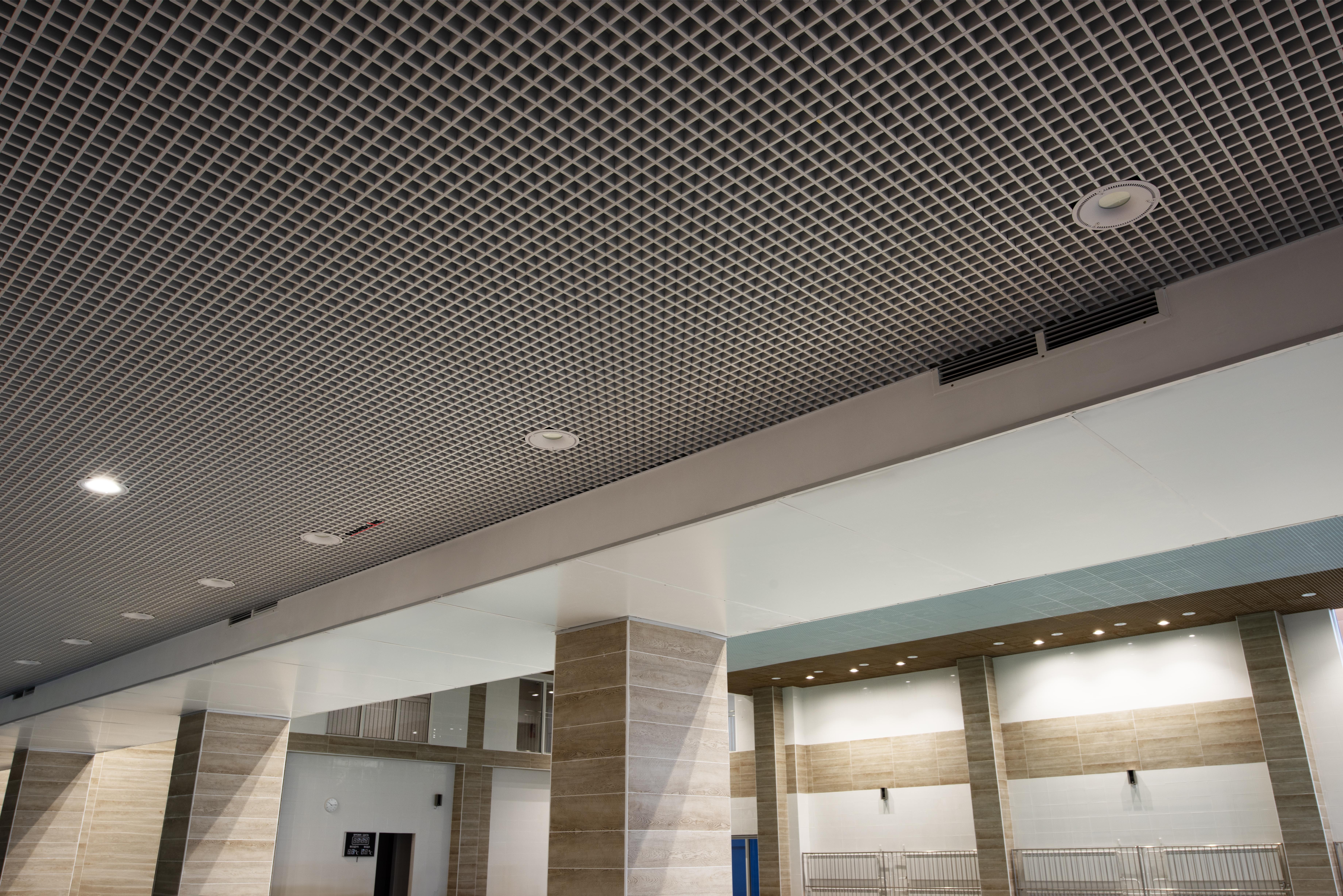 Применение: торговые центры, фитнес-центры, жилые комплексы, университеты, офисы, аэропорты. - Кассетные потолки — один из самых практичных видов подвесных потолков. Кассеты из алюминия или оцинкованной стали плотно прилегают друг к другу, скрывая все коммуникации и выравнивая линию потолка. Надолго сохраняют первоначальный внешний вид и удобны в уходе. Металлические кассеты с полимерным покрытием подходят для влажной уборки, что особенно важно для объектов с высокими требованиями к гигиене.