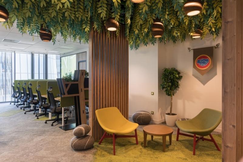 Все помещения объединены природной тематикой. При этом интерьер офисов, где расположены рабочие места линейных сотрудников, становится своего рода аллегорией на скаутский лагерь. Яркие цвета, преобладающие в оформлении, подчеркивают молодежный дух команды, поднимают настроение и способствуют эффективной работе.