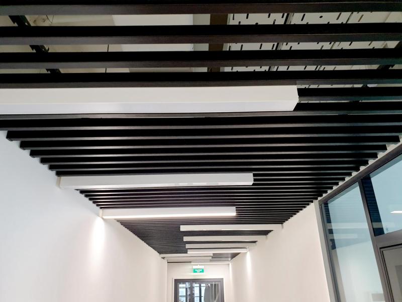 Яркий и динамичный запоминающийся образ создан с помощью контрастного реечного потолка Бард и линейных светильников.