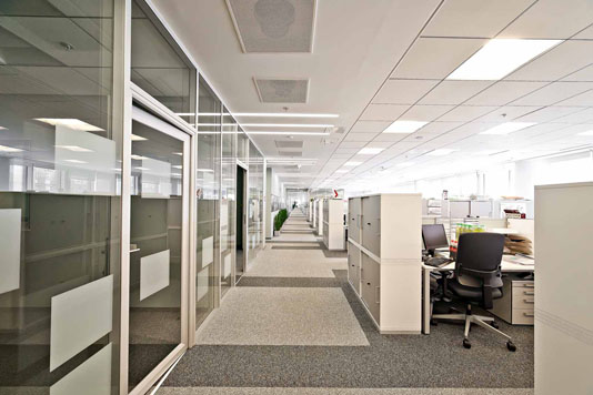 Идея архитекторов расположить рабочие места в открытом пространстве вдоль сплошного фасадного остекления и смещение кабинетов в центральную часть офиса способствовала созданию просторной и комфортной среды.