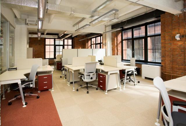 Яркий образ офиса запоминается особенно за счет контрастных решений напольных покрытий.